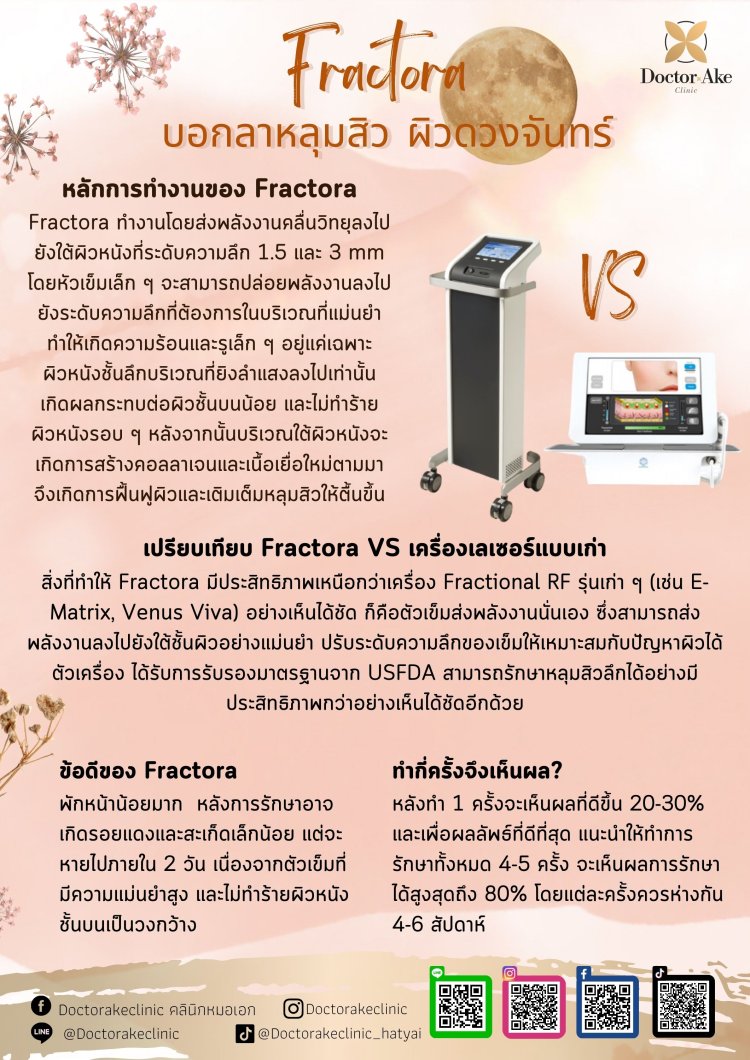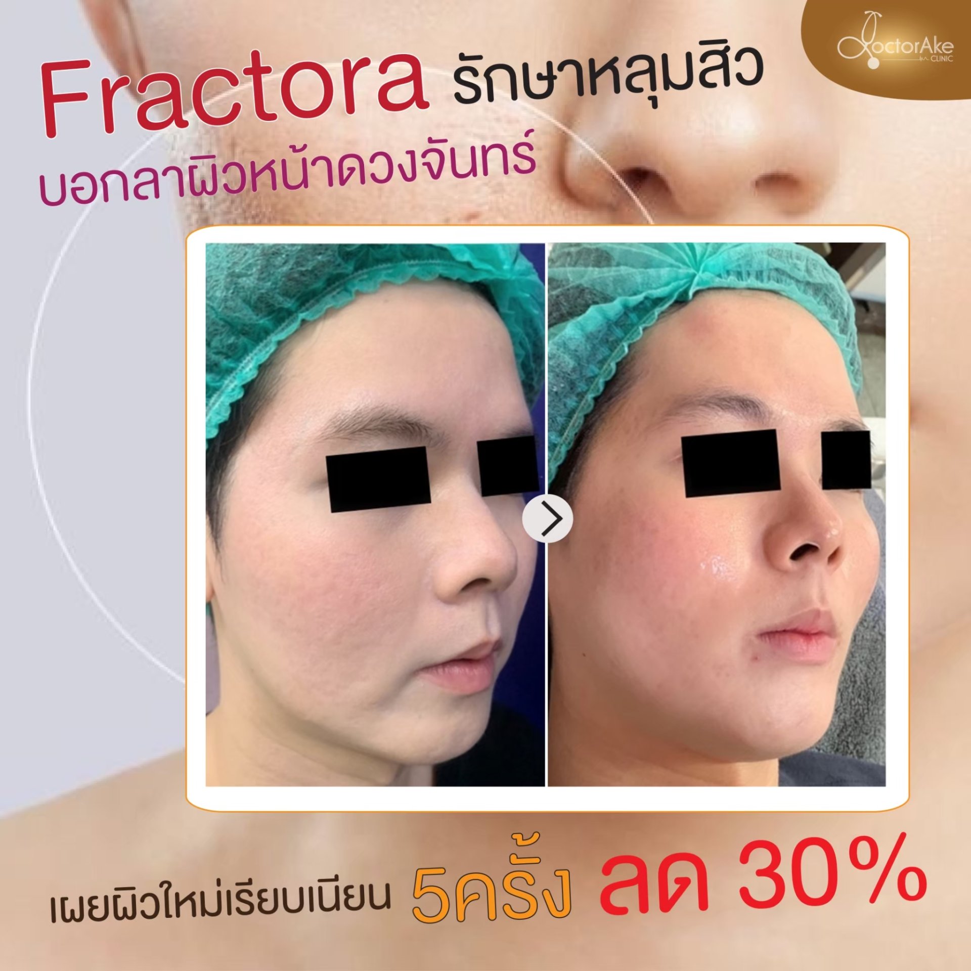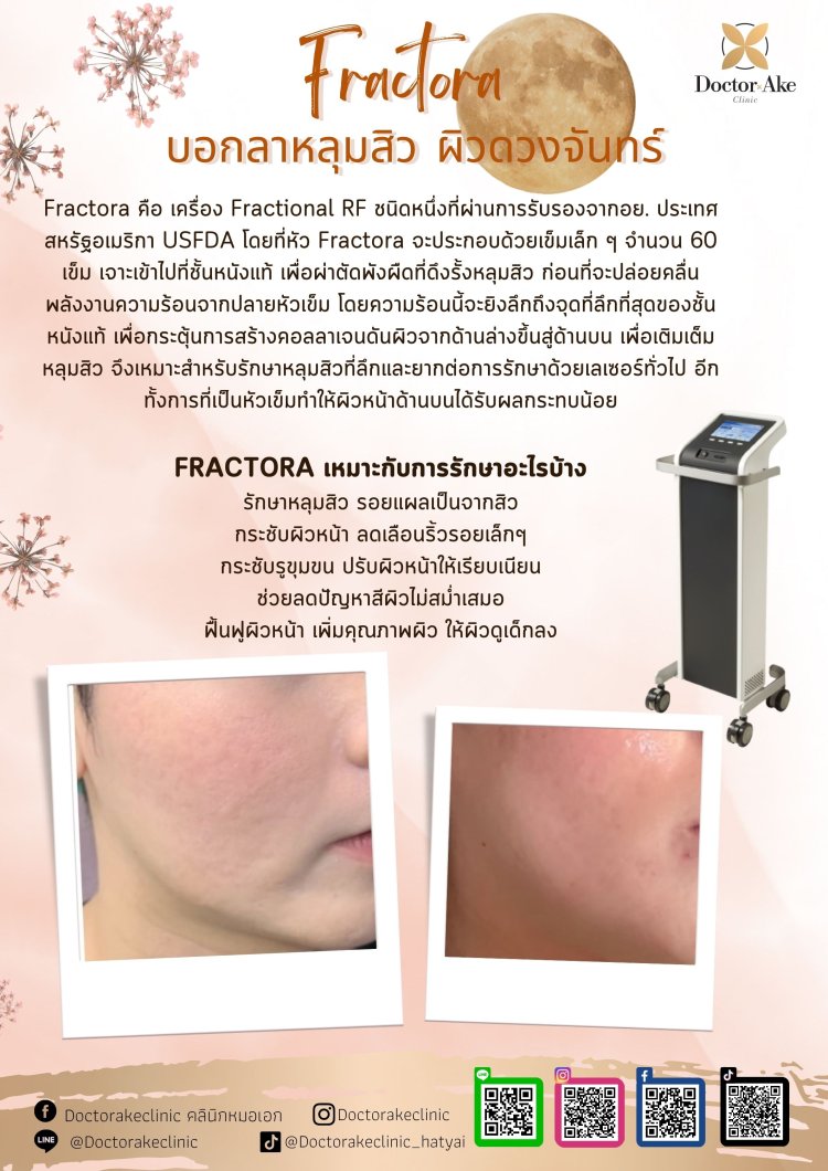 Fractora คือ เครื่อง Fractional RF ชนิดหนึ่งที่ผ่านการรับรองจากอย. ประเทศสหรัฐอเมริกา USFDA โดยที่หัว Fractora จะประกอบด้วยเข็มเล็ก ๆ จำนวน 60 เข็ม เจาะเข้าไปที่ชั้นหนังแท้ เพื่อผ่าตัดพังผืดที่ดึงรั้งหลุมสิว ก่อนที่จะปล่อยคลื่นพลังงานความร้อนจากปลายหัวเข็ม โดยความร้อนนี้จะยิงลึกถึงจุดที่ลึกที่สุดของชั้นหนังแท้ เพื่อกระตุ้นการสร้างคอลลาเจนดันผิวจากด้านล่างขึ้นสู่ด้านบน เพื่อเติมเต็มหลุมสิว จึงเหมาะสำหรับรักษาหลุมสิวที่ลึกและยากต่อการรักษาด้วยเลเซอร์ทั่วไป อีกทั้งการที่เป็นหัวเข็มทำให้ผิวหน้าด้านบนได้รับผลกระทบน้อย