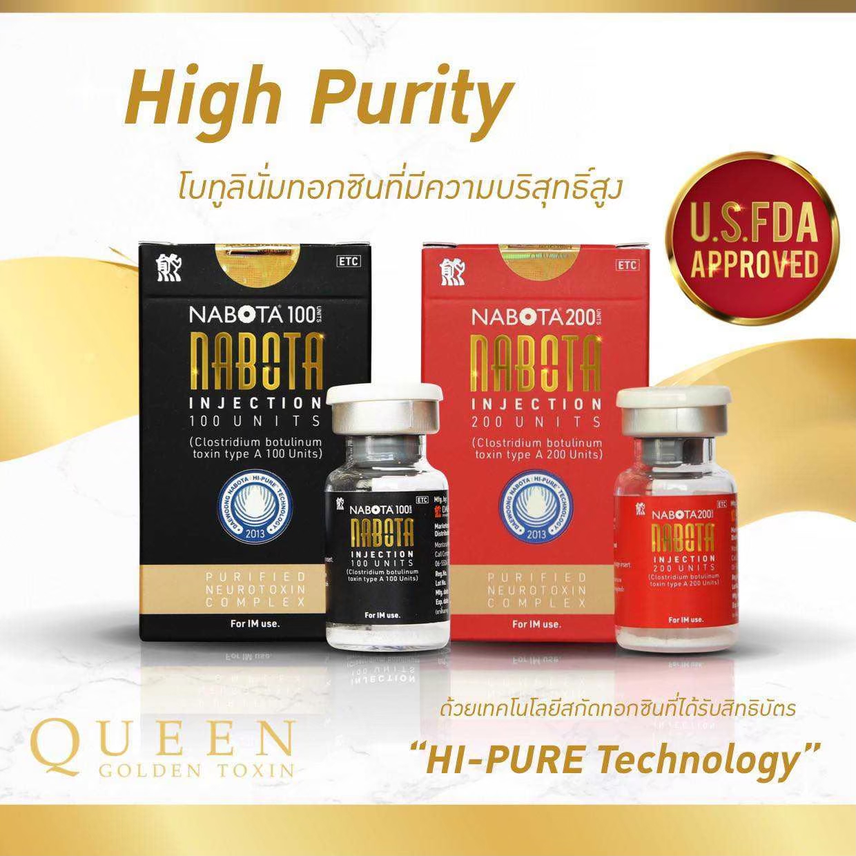 ตัวยามีความบริสุทธิ์สูงถึง 98.7% ซึ่งถือเป็นค่าบริสุทธิ์สูงที่สุดในปัจจุบันเห็นผลลัพธ์หรือการเปลี่ยนแปลงหลังฉีดค่อนข้างเร็วกว่ายี่ห้ออื่น เช่น ฉีด “Nabota ลดริ้วรอย” เพื่อลดริ้วรอยบนใบหน้าจะเห็นผลภายใน 2 วัน ในขณะที่ลดริ้วรอยยี่ห้ออื่นจะเห็นผลภายใน 5-7 วัน ฉีดแล้วหน้าจะดูเป็นธรรมชาติ ไม่ดูแข็งเกินไป เพราะในตัวยามีค่าความบริสุทธิ์ที่สูงมากในตัวยามีค่าความบริสุทธิ์ที่สูงมาก ทำให้มีโอกาสดื้อยาน้อยกว่ายี่ห้ออื่นตัวยาได้รับการยอมรับว่า มีความปลอดภัยสูง ไม่มีสารตกค้าง ไม่เป็นอันตราย และนิยมใช้กันทั่วโลก